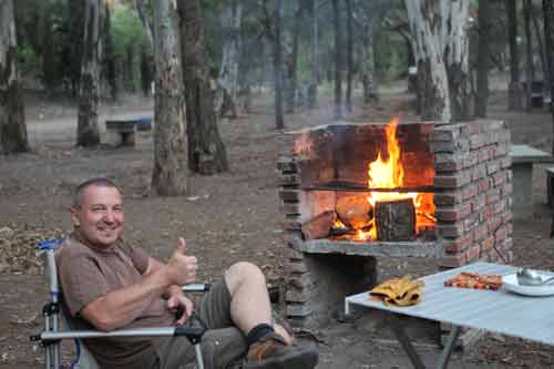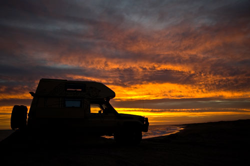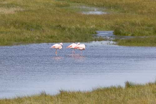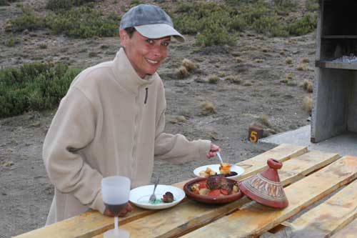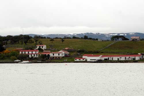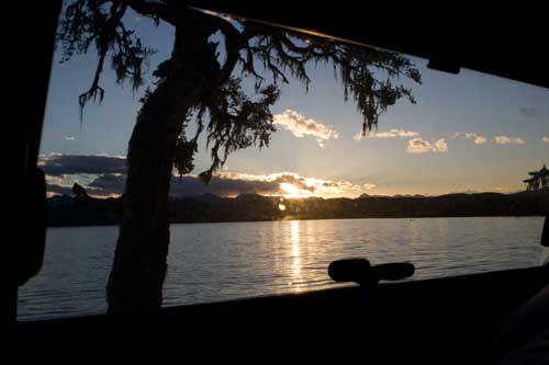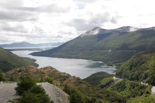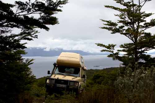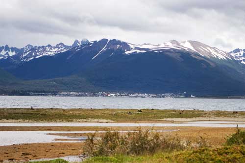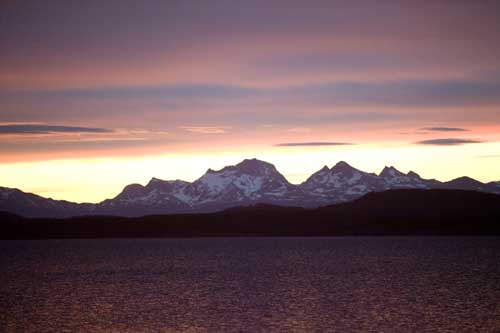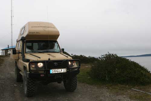 Guanakos gibt es hier in Argentinien reichlich hier im Nationalpark Monte Leon haben wir zum ersten Mal unseren, in Casablanca erworbenen, Feuertopf getestet: lecker Fleischpflanzerl mit Kartoffeln, Karotten und Paprika. ...Flamingos an der Ruta 3 Und schon gehts mit der Fähre in 20min nach Puerto Espora über die Magellanstrasse nach Feuerland eine argentinische Estanzia, idyllisch gelegen, da gibts keine Probleme mit dem Nachbarn langsam ändert sich die Landschaft, nicht mehr nur Pampa; man sieht mehr und mehr Bäume und es wird grün ...der langweilige abendliche Blick aus unserem Schlafzimmerfenster Sonnenaufgang, 3.30 Uhr am Lago Yehuin Das sind nicht unsere Alpen! Es ist der Anfang vom Ende der Welt: Im Nationalpark Tierra del Fuego gibt es richtige Wälder, nicht nur ein paar knorrige Stämme.