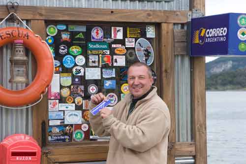 ...nun klebt auch unser Sticker am südlichsten Postamt der Welt. Ushuaia, mittlerweile ein großer Touristenort: von hier aus kann man alle möglichen Expeditionen per Schiff und Flugzeug buchen