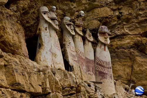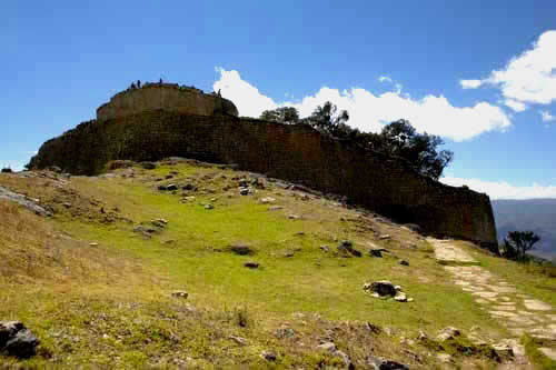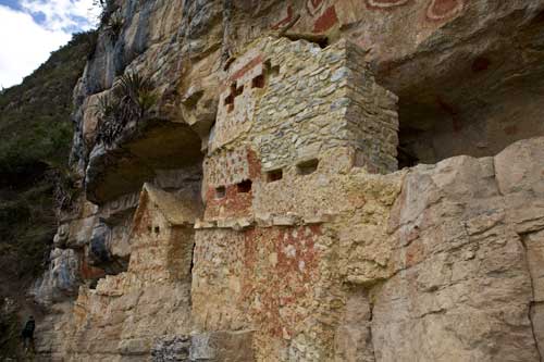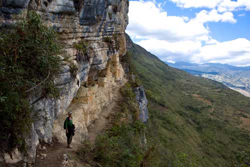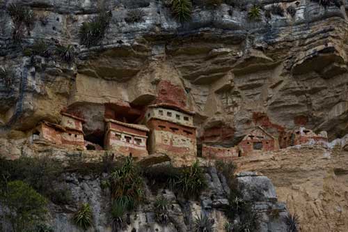 große Ansicht Namballe > Chachapoyas > Sarcofagos Karajia > Festung Kuelap > In Peru angekommen, machen wir uns auf den Weg nach Chachapoyas, ![]() in dem weiten Tal gibt es jede Menge Reisanbau ![]() schön angelegte Reisfelder begleiten uns einige Kilometer, ![]() der Rio Chinchipe bewässert nicht nur die Felder, sondern unterspült auch so manche Strasse. ![]() Nach der Stadt Jaen wird das Tal immer enger, ![]() nun führt die Strasse den Rio Utcubamba entlang und wird von hohen Bergen eingerahmt. ![]() Chachapoyas ist ein guter Ausgangspunkt um die Umgebung zu erkunden, ![]() Wir machen uns auf den Weg zu den Sarcofagos Karajia, vor rund 1000 Jahren wurden hier in einem steilen Felshang Grabstätten errichtet, ![]() die etwa 2,3m hohen Sarcofagos sind aus Lehm und mit geometrischen Mustern geschmückt. Hier wurden wohl die ranghöchsten Führer der Prä-Inka-Kultur bestattet. ![]() Wir müssen uns den Weg dorthin nicht mühsam suchen, sondern wir haben zwei reizende Führer, die uns begleiten und uns ausserdem noch einige Knochenfunde zeigen. ![]() Die nächste Ausgrabungsstätte, die wir besuchen ist ca. 2 Fahrstunden und eine 30minütige Wanderstrecke entfernt... ![]() allein der Weg dorthin lohnt, das Tal schlängelt sich durch die Berge, die teilweise 1000m und mehr links und rechts steil nach oben ragen. ![]() Wir verlassen nun das Tal und unser Weg führt rauf auf 3000m, oft führt die Strecke bedenklich nahe an den steilen Abhängen entlang bis wir endlich die Festung Kuelap erreichen, ![]() auf einem Bergrücken der Andenhänge thront die Festung und wurde inzwischen von der Unesco zum Welterbe erklärt. ![]() Es gibt 3 Eingänge, die sich auf ca. 1m Breite verjüngen, so dass ein einzelner Krieger diesen Zugang verteidigen konnte. ![]() Im Inneren der Festung haben wir das Gefühl wir befinden uns mitten im Dschungelbuch, in der verlorenen Stadt, ![]() die Mauerreste der Behausungen wurden von Pflanzen und Sträuchern eingenommen... ![]() und immer wieder schöne alte Bäume, die mit Bromelien bewachsen sind, ![]() inmitten der Anlage, Wohnhäuser oder was davon noch übrig ist, teilweise wieder aufgebaut, so dass man einen kleinen Einblick in die Lebensverhältnisse von damals bekommt. Unser Weg führt uns weiter das Tal entlang, ![]() bis hin zu den Felsengräbern von Revash... ![]() die hoch oben in einer Felswand versteckten Totenhäuser erreicht man über einen schmalen und abenteuerlichen Weg, nicht ganz ungefährlich... ![]() Diese Gräber und die dort geborgenen Mumien schätzt man auf ein Alter von ca. 800 Jahren, ![]() so dass die Anlage, die in mehreren Stockwerken angelegt ist, der Chacha-Kultur zugerechnet wird, die hier von 1100 bis 1300 n. Chr. existierte. In Leimebamba besuchen wir das hiesige Museum...