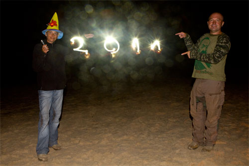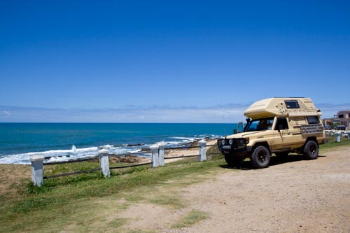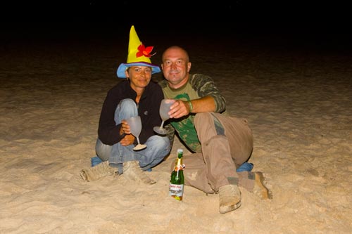 Am nächsten Morgen geht es vorbei am uruguayischen Zoll zurück nach Chuy um noch so einige Besorgungen zu machen, diese Stadt ist halb Uruguay und halb Brasilien. Achtung, wir haben leider unbewusst in Brasilien eingekauft. Als wir wieder am Zoll vorbeikommen, der ausserhalb der Stadt Richtung Süden liegt, wollen die Beamten nun doch in unsern Toyo schauen. Kein Problem denken wir, aber auch hier, warum auch immer, darf man keine pflanzlichen und tierischen Produkte aus Brasilien einführen... So müssen wir unsere kürzlich erworbenen Kartoffeln wieder abgeben. Wenn wir sie im gegenüberliegenden Geschäft gekauft hätten, wäre alles in Ordnung gewesen (Kassenzettel aufbewahren). Es hat den Anschein,als ob die Hauptstrasse, die von Westen nach Osten verläuft auch die offizielle Staatsgrenze ist. Parque National Santa Teresa, schön angelegter und gepflegter Park. Die Gebäude, wir hier das der Polizei sind fantasievoll und geschmackvoll gestaltet, ![]() der Strand ist klasse.... so klappern wir nach und nach die Strände von Uruguay ab. ![]() Immer Richtung Colonia, da wir von dort mit dem Buqubus nach Buenos Aires übersetzen wollen. ![]() Punto del Diablo, ein sehr schönes kleines Fischerdorf, das nun in der Hauptreisezeit hauptsächlich mit Touristen aus Uruguay, Argentinien und Brasilien bevölkert wird. ![]() Hier gefällt es uns sehr gut, super schönes Wasser zum Baden, herrlicher Strand zum Spazierengehen. Ein kleines Städtchen zum Shoppen und Essengehen oder einfach nur am Strand sitzen und das tägliche Treiben beobachten, wie hier, wenn die Fischer ihre Boote zu Wasser lassen. ![]() Wir übernachten hier auf der Landzunge, die hinaus zum Leuchtturm führt. Von hier aus haben wir einen tollen Blick auf das Städtle. ![]() Strandabschnitt in der Nähe von Aguas Dulces kurz vor dem Parque National Dunas de Cabo Polonio, den man leider nicht mit dem eigenen Fahrzeug befahren darf. Nur mit den bereit stehenden Tourunternehmen, das wollten wir aber nicht. ![]() Kurz vor der Stadt La Paloma befindet sich La Pedrera, der perfekte Platz um den Jahreswechsel zu feiern, also nisten wir uns auf dem Campingplatz Punta Rubia ein. ![]() So können wir Silvester mal ganz anders feiern, am Strand im Sand bei angenehmer Nachttemperatur von 20 Grad stossen wir auf das Jahr 2011 an. ![]() Und Brigitte zaubert dann noch eine tolle Show zur Begrüßung des neuen Jahres. ![]()