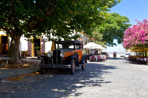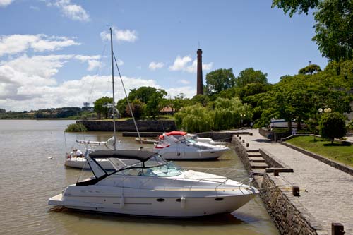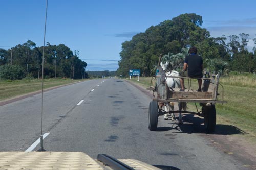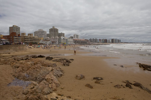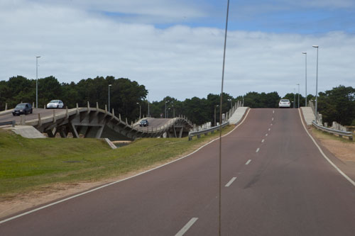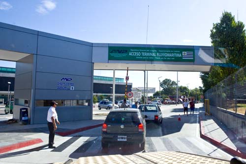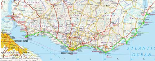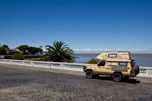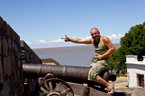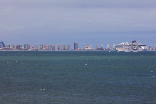 Der Blick von hier auf den kleinen Ort La Pedrera... ![]() Am Neujahrstag fahren wir weiter, da unser Verschiffungstermin in Buenos Aires z.Zt. der 04.01.2011 ist. ![]() Immer wieder vorbei an tollen Stränden, aber nun sinken mit jedem Kilometer die Wassertemperaturen, für uns ist es nun bereits zu kalt zum Baden. ![]() Die Anfahrt auf Punta del Este ist ja schon mal sehr interessant, nette Brücke, ![]() ein Stück weiter ragen schon die ersten Wolkenkratzer in den Himmel, ![]() am Strand ist einfach nur Schönsein angesagt, bräunen, joggen, surfen und sich sehen lassen. ![]() Ein Blick zurück, uns hat die Stadt gut gefallen, eine saubere und mit einem unbeschreibbarem Flair behaftete Großstadt, mit sehr schönen Stränden und die Hochhäuser bieten uns ein super Panorama. ![]() Colonia del Sacramento ist dagegen eine Kleinstadt, sehenswert ist der historische Teil, ![]() mit der Strandpromenade, ![]() den Resten der Befestigungsanlage, ![]() den alten Autos, die teilweise noch fahren, ![]() oder als Blumentopf umfunktioniert sind, ![]() den Gassen mit dem alten Kopfsteinpflaster, ![]() den Lokalen, die hier überall ihre Tische im Freien stehen haben ![]() und dem Jachthafen ![]() mit den nicht ganz billigen Schiffen. Heute haben wir bei Buquebus die Fastferry "Silvia Ana L" gebucht, morgen 19:01 Uhr werden wir in Uruguay ablegen und eine Stunde später in Argentinien an Land gehen. Cool, wenn es so wie beim Münchhausen gehen würde, ein kurzer Ritt auf der Kanonenkugel und schon sind wir da. ![]() Migration für Uruguay und Argentinien, sowie der Zoll Uruguay sind erledigt, es geht rauf auf die Fähre. Wir müssen warten bis alle Fahrzeuge verladen sind, denn die Plätze für die etwas höheren Autos sind nur wenige und im Heck des Schiffes...