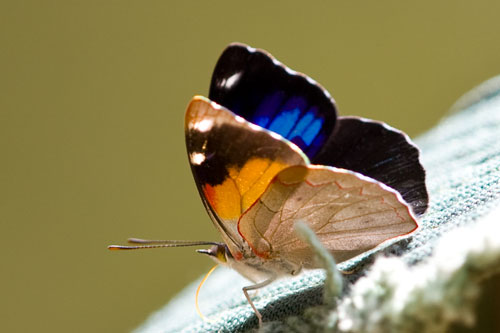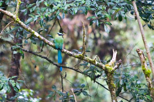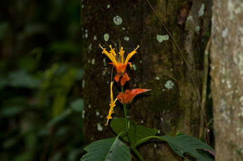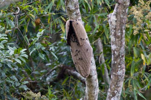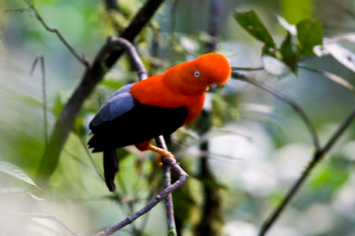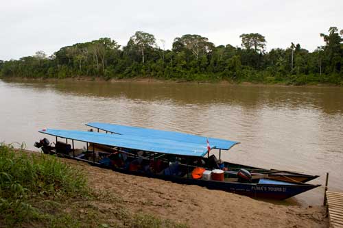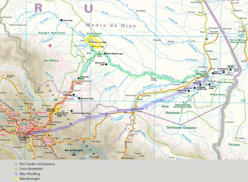 Nach langen Hin und Her haben wir uns für eine Tour mit "Manu Nature Tours" entschieden. Eine 7Tage / 6Nächte Dschungeltour, Übernachtungen in Dschungellodges und Rückflug. Mit dem Bus geht es dann von Cusco aus über Paucartambo in den Manu National Park. Die Fahrt bis zur ersten Unterkunft dauert ca. 10 Stunden. ... am Wegrand immer wieder schöne exotische Blüten und Blätter, hier sind an der Unterseite seltsame Noppen zwischendurch auch mal ein Wasserfall und jede Menge Blumen in den verschiedensten Farben und Ausführungen Tiere dürfen natürlich auch nicht fehlen, hier ein Blue-crowned Motmot (39cm) oder wie hier ein Common Woolly Monkey (70cm mit Schwanz) abends kommen wir nach vielen Fotostopps in der Manu Cloud Forest Lodge an... schöne Zimmer mit Dusche und WC, auch ein kleiner privater Balkon gehört dazu. Am nächsten Morgen geht es dann vor dem Frühstück zu den Cock of the Rock (32cm), hier macht sich der Invest des 2. Guides schon bemerkbar, wir sind zu viert mit einem Guide unterwegs. Klasse. An der Beobachtungsplattform tummeln sich die Vögel und balzen um die Wette, leider ist kein Weibchen in Sicht. Nach dem Frühstück steht Wandern auf dem Programm, leider gibt es hier keinen Wanderweg oder Pfade, die wir nutzen könnten, so geht es auf der Strasse entlang. natürlich wieder viele interessante Pflanzen und eine tolle Aussicht ins Tal hinein, beharrte Blätter, bunte Insekten, die ganz friedlich sind, Schmetterlinge im Überfluß, in den verschiedensten Farben und Größen, hier der berühmte 88 Butterfly, Callicore clymena ( 5cm Spannweite) und viele "ohne Name" oder die wir nicht kennen Lesser Kiskadee (18cm) die sind schon schön auch bevor sie fliegen können sind sie schön anzusehen ein Wespennest, perfekt in der Bauweise, die Öffnung geschützt mit einem Vordach zweite und letzte Nacht in der Manu Cloud Forest Lodge Blick vom Balkon direkt über dem Fluß Früh morgens brechen wir auf nach Atalaya, wo unser Boot auf uns wartet und wir dann den Upper Madre de Dios River und später den Manu River bis zur Manu Lodge am Juarez Lake folgen... ... oder warten sollte: kein Boot da für uns, nach einiger Zeit stellt sich heraus, dass der Bootsführer nicht abfährt, da angeblich noch irgendwelche Ausstände vorhanden sind...