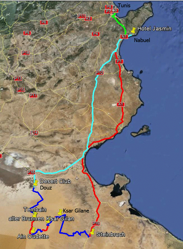 Von Tunis über Hammamet nach Nabeul sind es nicht ganz 100 km. Am nächsten Morgen starten wir Richtung Sahara Ksar Gilane..