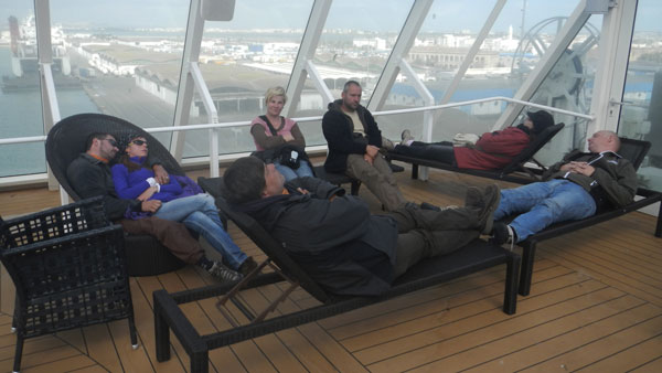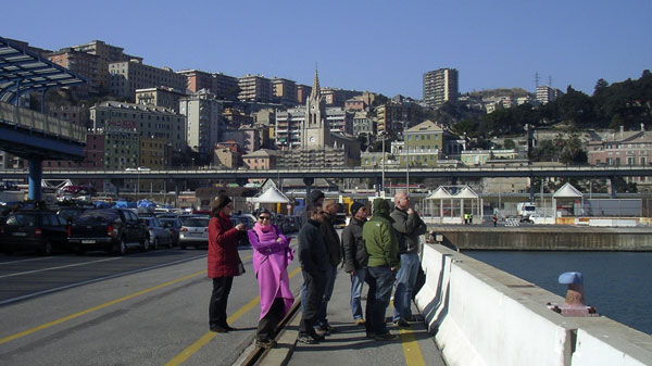 ... die Route 11 Leute Strahlender Sonnenschein, aber bitterkalt.... Genua Hafen, bei sehr ungemütlichem Wetter, Wind und Kälte warten wir bis das Schiff einläuft.