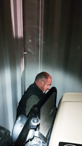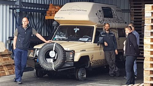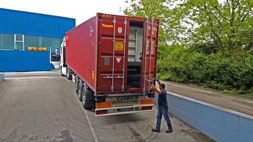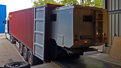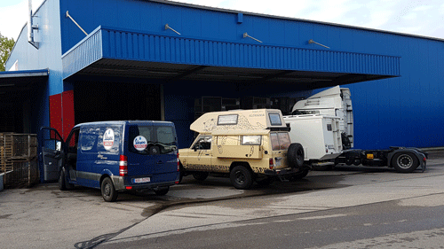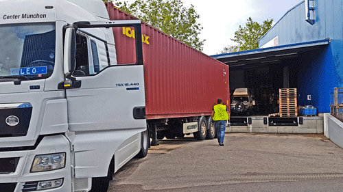 Spedition Nuber Danke an Rolf, der alles so super organisiert hat. Anfahrt 50km... ein Traum und kein Verkehr Erich und Christine mit ihrem Landcruiser sind auch schon eingetroffen. Und volle Unterstützung von den Desert-Tec'lern Michi und Thomas die tatkräftig mit ihrer Erfahrung und dem nötigen Verzurr- und Sicherungsmaterial die Sache in die Hand genommen haben. Danke ... jetzt heißt es die Zeit zu nutzen und alles vorbereiten bis der Lkw kommt. fertig... und schon ist er da... läuft Hand in Hand unser Team, Thomas, Michi, Christine und Erich hat sich versteckt (von links nach recht) Thomas in Aktion, der Monstertoyo kommt als erster rein, bis auf Anschlag... gut das Thomas so schlank ist viel Platz gibt es da nicht zum verzurren, aber er kann das. geschafft das erste Auto ist fest... und schon verschwindet Nummer 2 im Container, ganzschön knapp ...und schon ist alles vorbei. __________________________________________________________________________ Türe zu