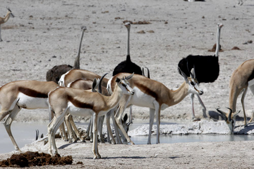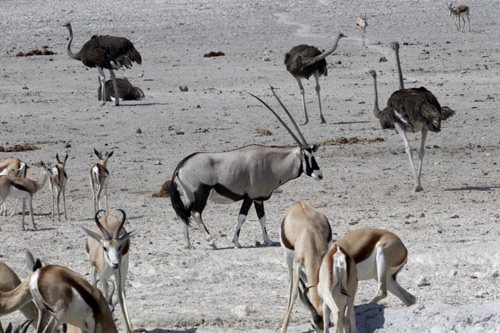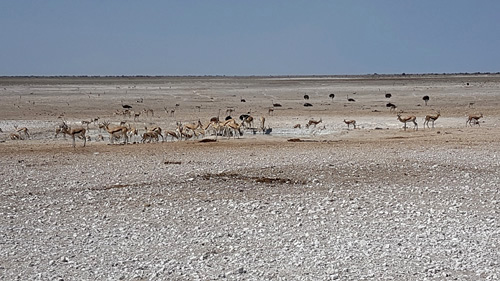 "Springbock" "Afrikanischer Strauß" "Oryx" "Zebra" durch die langanhaltende Trockenheit sind sehr viele Tiere zu sehen